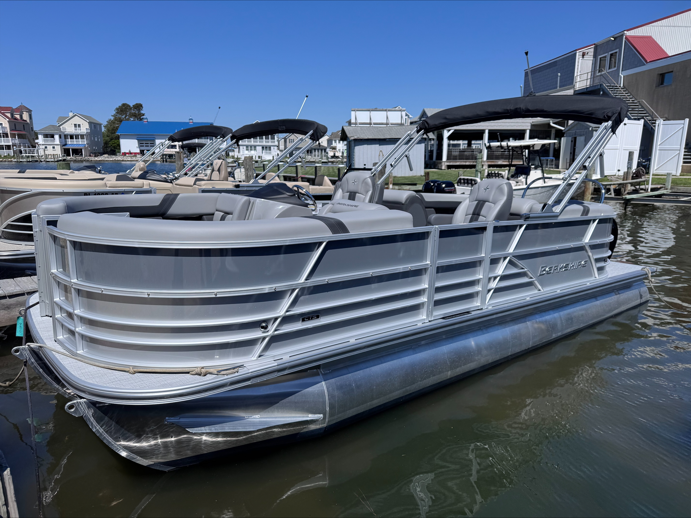 This tri-toon is equipped with a live well, 150 horsepower Mercury motor, Maryland fishing license, Lowrance Hook chart plotter, power electric bimini, Wet Sounds audio system with bluetooth, Seastar Hydraulic Steering, tilt and steering, wireless charger at the helm.